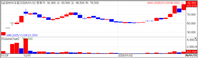 Samyang Biopharm had been absorbed by Samyang Holdings in 2021 and operated as an in-house independent company (CIC). It was spun off and relisted on November 24 last year for its standalone value to be properly recognized by the market. On its first trading day, Samyang Biopharm closed at won 30,200, up won 6,950 (29.89%). In just about two months since then, its corporate value has tripled.