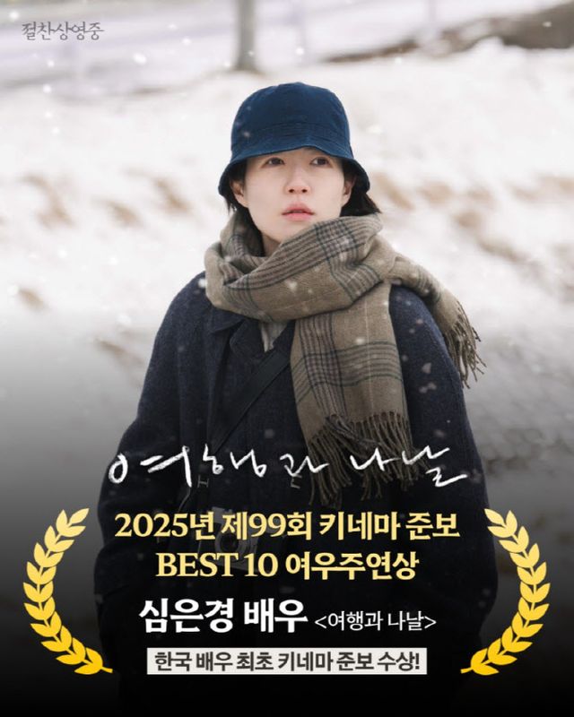 독립예술영화 시장의 어려운 환경 속에서도 오롯이 관객들의 입소문과 자발적인 추천만으로 6만 관객을 돌파한 ‘여행과 나날’은 꾸준한 N차 관람 열풍을 이어가며 장기 흥행 중이다. 이 가운데 일본 영화계에서 가장 권위 있는 시상식 중 하나로 손꼽히는 키네마 준보에서 일본영화 베스트 10 1위에 오르는 쾌거를 달성했다. 더불어 극중 각본가 ‘이’ 역을 맡은 배우 심은경 역시 제99회 키네마 준보 베스트 10 여우주연상을 수상하며 작품을 더욱 빛냈다. ‘여행과 나날’은 어쩌면 끝이라고 생각한 각본가 ‘이’가 어쩌다 떠나온 설국의 여관에서 의외의 시간을 보내면서 다시 시작되는 2025년 겨울, 일상 여행자들과 함께 떠나는 꿈 같은 이야기를 그린다.