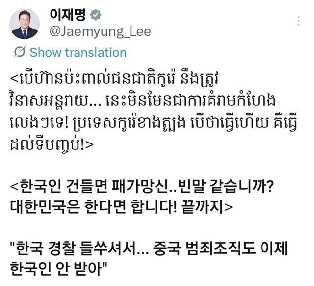이재명 대통령은 캄보디아어로 같은 내용을 게시물에 올리기도 했다.
