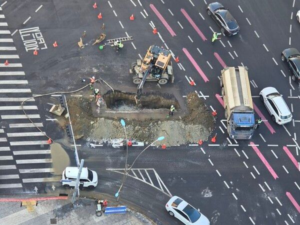 이 누수로 인천타워대로 국제업무지구역 방향 3개 차로와 아트센터대로 아트센터인천 방향 좌회선 차로가 통제되고 있다.