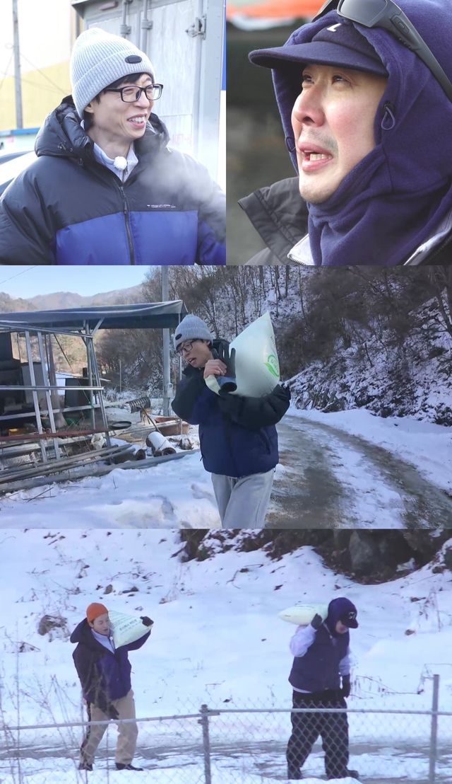 이어 네 사람은 20kg 염화칼슘 포대를 짊어지고 눈길을 오르기 시작한다. 허경환과 하하는 “아이고 키가 줄어드네”라고 낑낑대면서 혼신의 힘을 다하고, 1등으로 올라가는 유재석의 체력에 감탄한다.