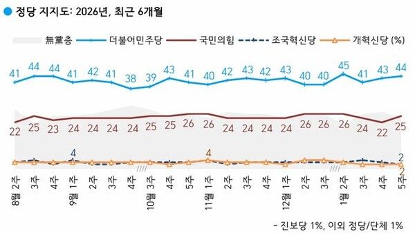 조국혁신당과 개혁신당은 각각 2%를 기록했다. 진보당은 1%이며, 지지하는 정당이 없는 무당층은 24%다.