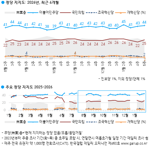 한국갤럽이 지난 27~29일 전국 만 18세 이상 남녀 1001명을 대상으로 정당 지지율 조사를 실시한 결과(95% 신뢰수준에 ±3.1% 포인트) 민주당 44%, 국민의힘 25%, 조국혁신당, 개혁신당 각각 2%, 진보당 1% 등으로 나타났다.