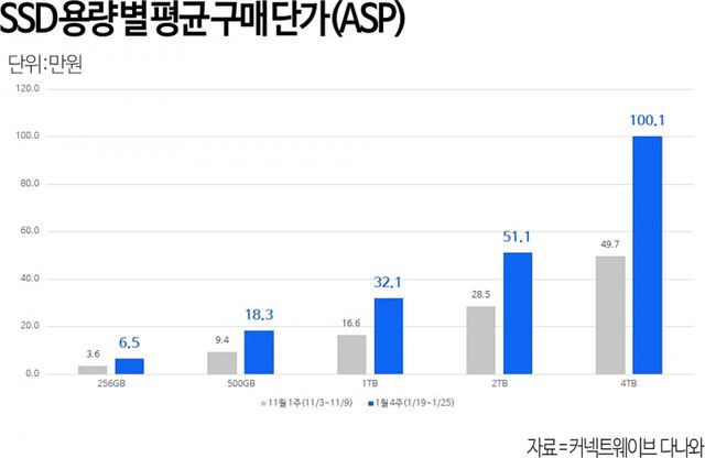 다나와에 따르면 4TB SSD의 1월 4주차(1월 19일~1월 25일) 평균 구매가는 100만1000원으로, 지난해 11월 1주차(11월 3일~11월 9일) 49만7000원 대비 2배 이상 올랐다.