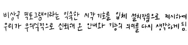 작품은 아크릴, 나무, LED, 페트 등 실제 공공장소 안내판에 사용되는 재료로 만들어졌다. 원래는 벽에 붙어 있어야 할 비상구 표지가 입체 구조물로 서 있는 순간, 너무도 익숙한 기호는 갑자기 낯선 존재로 변한다. 그렇다고 이 낯섦이 부담스럽게 느껴지지는 않는다. 관람자는 먼저 “아, 비상구네” 하고 고개를 끄덕이지만, 곧이어 “그런데 왜 여기에 있지?”라는 질문을 떠올리게 된다. LED 조명은 실제 비상구처럼 또렷하게 빛나고, 전체적인 분위기는 오히려 가볍고 재미있다. 이 표지는 비상구와 작품 사이의 경계를 흐리며, 관람자로 하여금 감상보다 탈출이라는 기능을 먼저 떠올리게 한다.