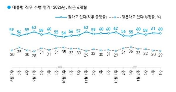 이재명 대통령의 직무 수행에 대해 '잘하고 있다'는 긍정 평가는 60%, '잘못하고 있다'는 부정 평가가 29%라는 여론조사 결과가 30일 나왔다.