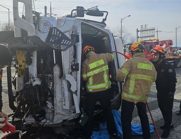 사고는 신호를 위반해 교차로로 진입한 우유운송차량이 정상 주행 중이던 A씨의 화물차를 들이받으면서 난 것으로 파악됐다.
