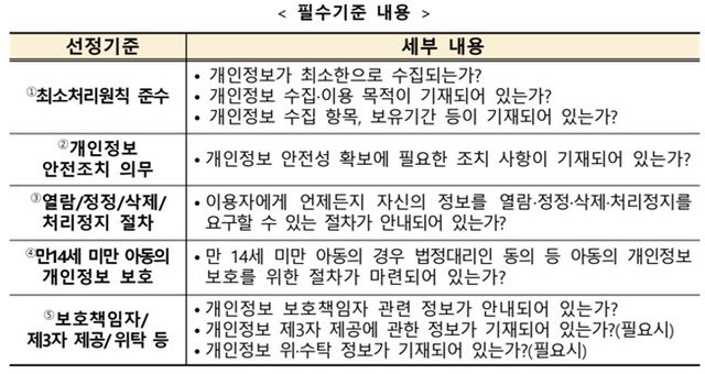 세부적으로는 △학습지원 SW가 학생 개인정보를 최소한으로 수집하는지 △개인정보 안전성 확보에 필요한 조치가 기재돼 있는지 △개인정보 수집·이용 목적과 수집항목·보유기간이 기재돼 있는지 △개인정보 보호책임자 관련 정보가 안내돼 있는지 등 9개 항목으로 구성돼 있다.