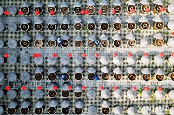[서울=뉴시스] 29일(현지 시간) 중국 산둥성 텅저우의 한 전통 양조장에서 직원들이 발효 중인 간장을 저어 섞고 있다.