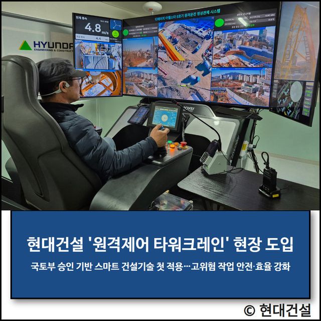 현대건설 관계자는 "국내 건설 현장 최초의 원격조정 타워크레인 도입은 고위험 작업 환경에서의 안전 관리 강화와 작업 여건 개선을 위한 기술 도입 사례"라며 "디지털 기반 운영 방식을 주요 작업 영역으로 확대해 현장 운영의 안정성과 효율을 높여 나갈 것"이라고 전했다.