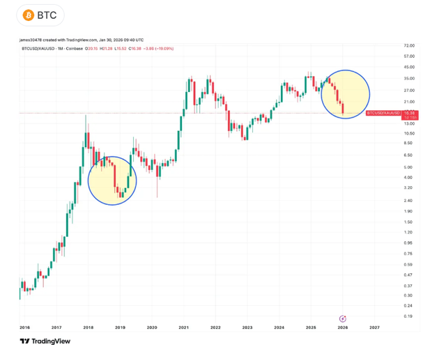| 한스경제=전시현 기자 | 비트코인이 금 대비 6개월 연속 약세를 기록하면서 2019~2020년에 나타났던 패턴이 재현되고 있다는 분석이 나왔다.