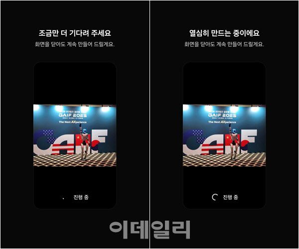 대기 시간은 생각보다 걸린다. 초반엔 1~2분 내에 완성됐지만, 최근엔 이용자가 몰려서 그런지 생성 완료까지 수십분의 대기 시간이 발생했다. 화면엔 ‘열심히 만드는 중이에요’, ‘조금만 더 기다려 주세요’라는 안내 문구가 뜬다. 화면을 닫아도 계속 만들어주고 알림 톡방을 통해 결과물을 따로 보내주기에 계속 지켜볼 필요는 없다. 사진을 걸어두고 평소처럼 대화를 나누다 보면 어느새 완료 알림이 떠서 ‘깜짝 선물’이 도착해 있는 느낌을 받을 수 있었다.