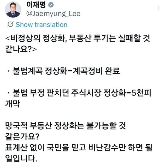 이 대통령은 이어 “부동산 정상화는 5000피, 계곡정비보다 훨씬 쉽고 더 중요한 일”이라며 부동산 정책 관련 강경 대응을 예고했다.