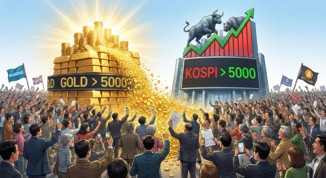 대표적인 안전자산인 금과 위험자산으로 분류되는 코스피가 '5000시대'를 맞이하며 고공행진 중에 있다. ⓒ 제미나이 생성 이미지.