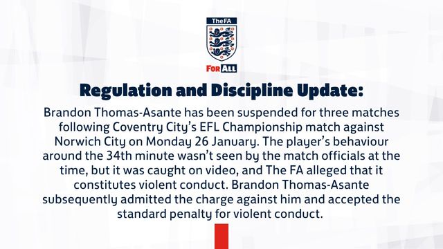 코번트리 시티는 지난 30일 구단 공식 홈페이지를 통해 FA의 입장을 전하며 "브랜든 토마스-아산테가 경기 중 폭력 행위와 관련된 FA의 기소 내용을 인정했고, 이에 따라 표준 징계를 수용했다"고 밝혔다. 이어 "이번 징계로 토마스-아산테는 향후 공식전 3경기에 출전할 수 없게 됐다"고 전했다.