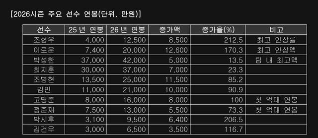 그 외에도 지난 시즌 69경기 5승4패 30세이브 평균자책점 1.60을 기록하며 리그 최고 마무리 투수로 활약한 조병현은 1억 3500만원에서 2억 5000만원(85.2%)으로 연봉이 인상됐다. 트레이드 이적 후 70경기(63⅔이닝) 5승2패 1세이브 22홀드 평균자책점 2.97을 기록한 김민은 1억 1000만원에서 1억원(90.9%) 인상된 2억 1000만원에 도장을 찍었다.