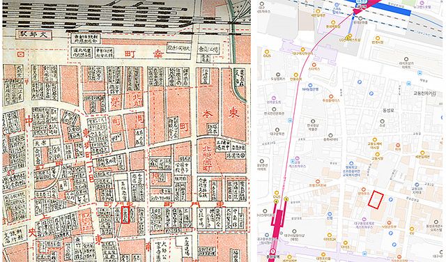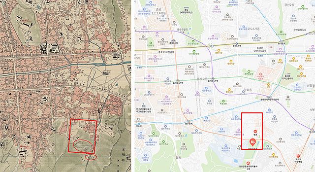 아래의 왼쪽 지도에서 보면 빨간 네모로 표시한 곳을 니시시켄초로 추정할 수 있고 빨간 네모 밖 아래쪽의 동그라미 부분은 장충단이다. 그리고 빨간 네모 안의 동그라미 부분에 191, 192, 195 번지가 표시되어 있는데, 오구라 다케노스케 저택이 193번지였으므로 빨간 네모 안의 동그라미 부분 중 번지수가 표시되지 않은 몇몇 건물 중에 그의 저택이었을 것으로 추정된다.