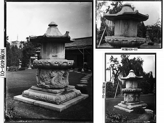 한편 석탑이나 석불과 같이 무겁고 큰 석조 유물들은 저택 마당에 놓았다. 아래 사진은 오구라 다케노스케가 소장했을 당시의 석조부도 사진이다. 이 석조부도는 '대구 산격동 연화 운룡장식 승탑'(大邱 山格洞 蓮花 雲龍裝飾 僧塔)이며, 현재 경북대학교가 소장하고 있다. 고려시대 제작되었고, 1963년 1월에 보물 제135호로 지정되었다.