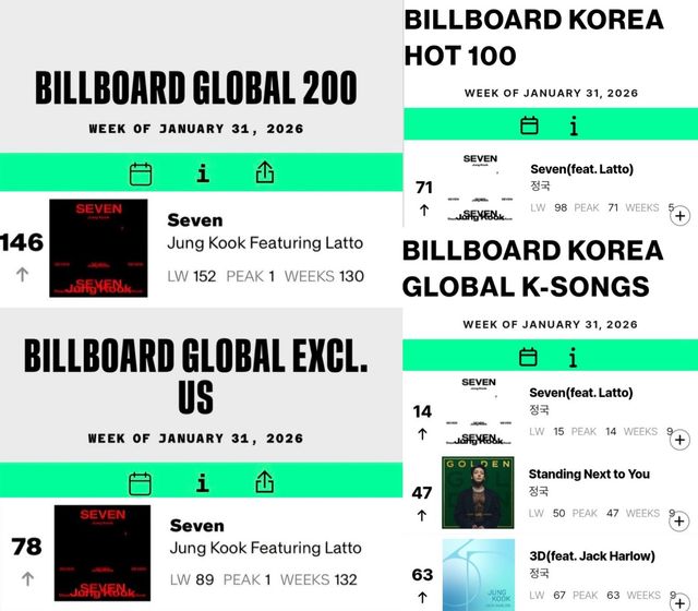 같은 날 공개된 ‘글로벌(미국 제외)’ 차트에서는 78위를 기록했다. 이 차트에서도 ‘Seven’은 132주 동안 이름을 올리며 아시아 솔로 가수 가운데 최장 기간 차트인 기록을 유지했다. 두 글로벌 차트에서 모두 전주 대비 순위가 상승한 점도 눈에 띈다. ‘글로벌 200’에서는 6계단, ‘글로벌(미국 제외)’에서는 11계단 순위를 끌어올리며 장기 흥행 곡의 저력을 보여줬다.