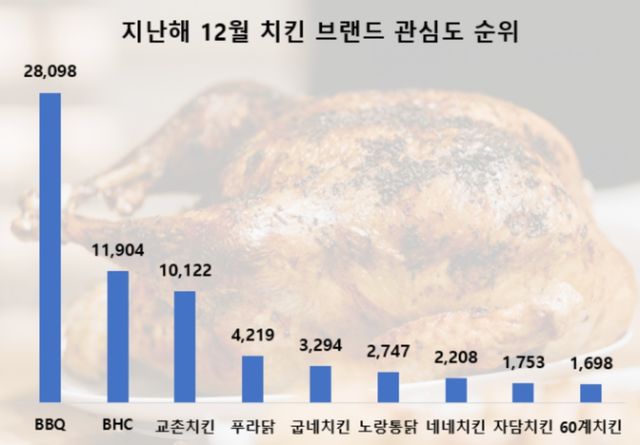 BHC도, 교촌도 아니었다. 지난해 12월, 국내 치킨 브랜드 가운데 소비자들의 온라인 관심이 가장 많이 쏠린 곳은 BBQ였다. 각종 포털과 커뮤니티를 중심으로 관련 언급이 가장 많이 이어지며 치킨 브랜드 관심도 1위에 이름을 올렸다.