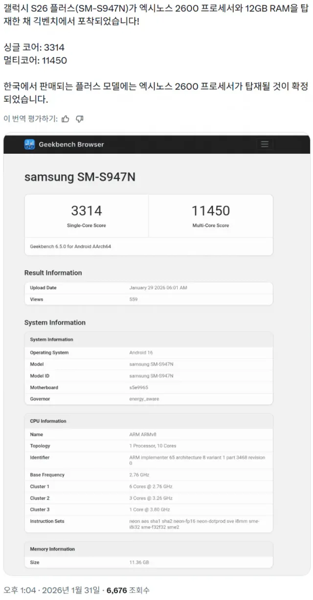 칩셋 (AP)싱글코어멀티코어비고엑시노스 2600 (이미지)3,31411,4502nm GAA, 10코어 (1+3+6)스냅드래곤 8 엘리트 (Gen 4)~3,200~10,000전작 대비 멀티코어 약 15% 우위애플 A18 Pro (아이폰 16P)~3,400~8,800싱글 대등, 멀티코어 압도적 우위엑시노스 2400 (S24)~2,200~7,000성능 약 60% 향상 (비약적 발전)엑시노스 2500 (미출시/폴더블)~2,500~8,100이전 세대 대비 확실한 체급 차이