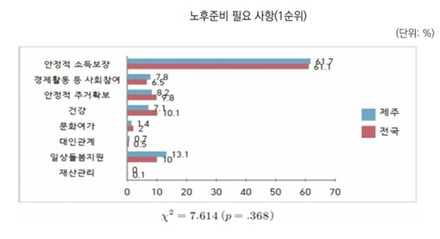 국가·사회에 요구하는 주요 사회 보장의 영역은 소득 보장(39.4%), 의료 보장(34.4%) 순이었다. 또한 노후 준비에 가장 필요한 사항에는 안정적 소득 보장(61.7%)에 이어 일상생활 활동과 돌봄 지원(13.1%)이 뒤를 따랐다.