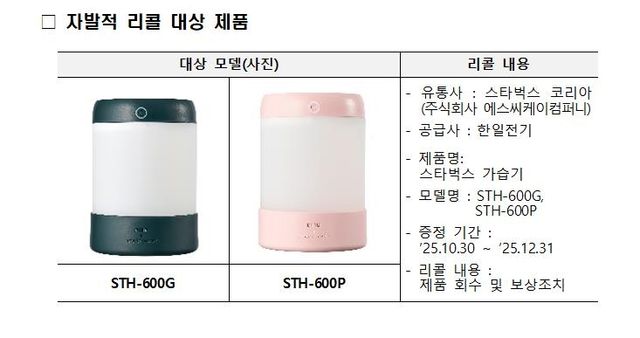 산업통상부 국가기술표준원(국표원)은 스타벅스 코리아(에스씨케이컴퍼니)가 작년 10∼12월 소비자에게 증정한 가습기 2개 모델(STH-600G·STH-600P) 전량에 대해 오는 2일부터 자발적 리콜(회수·보상 조치)을 실시한다고 1일 밝혔다.