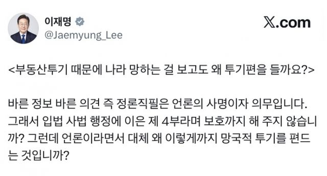 이 대통령은 1일 엑스(X·옛 트위터)에 '혼돈의 주택시장, 다주택 규제의 10가지 부작용'이라는 제목의 기사를 링크하면서 "부동산 투기 때문에 나라 망하는 것을 보고도 왜 투기 편을 드는 것인가"라고 언급했다.