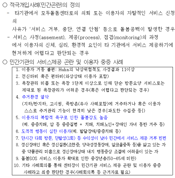 서울시는 적극개입 비율이 18.9%에 불과하다고 주장한다. 적극개입은 민간기관에 존재하지 않는 공공돌봄기관 고유의 서비스 분류체계다. 민간기관에서는 소위 블랙리스트로 불리거나 기피돼 반복적으로 중도 이탈하고 제공이 거부된 사례, 다인·고난도·갈등·위기 상황이 결합된 사례를 공공이 마지막으로 책임지는 돌봄, 그것이 적극개입이다. 즉, 적극개입은 '민간과 동일한 조건에서 경쟁하는 서비스'가 아니라, 민간 돌봄의 한계가 드러난 지점에서 공공이 개입한 결과물이다. 이 돌봄을 수행했다는 사실 자체가 민간과의 차별성이며, 공공성이다.
