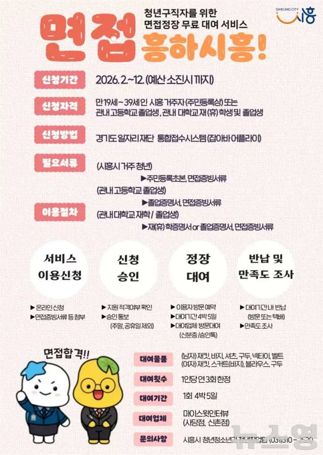 (뉴스영 이현정 기자) 시흥시는 청년 구직자의 사회 진출을 응원하기 위해 2026년도 면접정장 대여지원 사업 '면접 흥하시흥!'을 1일부터 시작한다고 밝혔다.