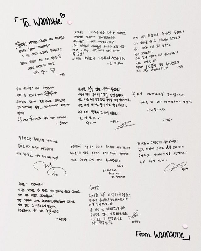 1일 워너원 공식 SNS를 통해 팬덤 워너블에게 전하는 멤버들의 메시지가 담긴 사진 한 장이 공개됐다.