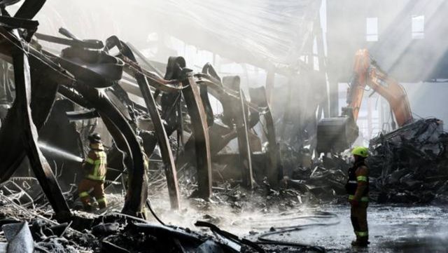 지난달 31일 충북 음성군 맹동면 두성리의 한 생활용품 제조공장에서 소방당국이 잔불 정리를 하고 있다. / 연합뉴스