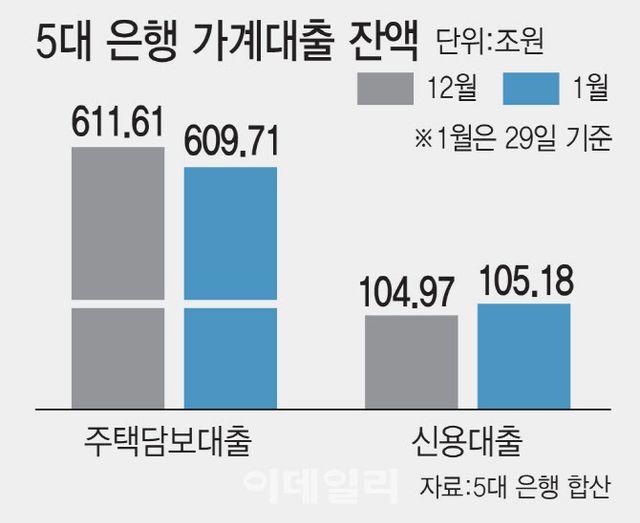 1일 금융권에 따르면 5대 은행(KB국민·신한·하나·우리·NH농협은행)의 가계대출 잔액은 지난달 29일 기준 765조8619억원으로 집계됐다. 작년 말(767조6781억원)보다 1조8162억원 줄었다. 남은 이틀 동안 가계대출이 일부 늘었더라도 1월 전체로는 감소가 확실시된다.