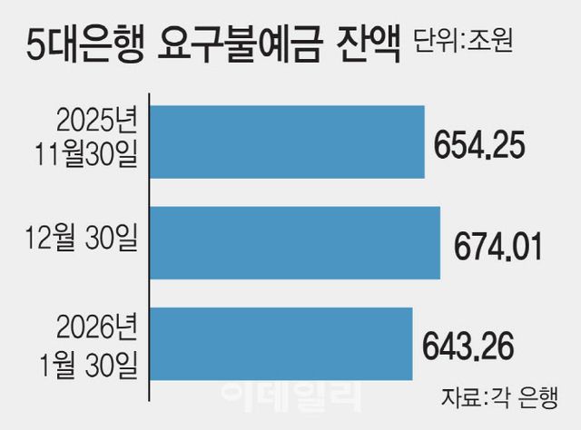 가계대출이 감소 흐름을 보이는 동시에 새해 들어 거의 한 달 사이 5대 은행에서 빠져 나간 대기 자금은 30조원이 넘었다. 이는 한달 기준 34조원치가 빠진 2023년 1월 이후 최대다. 30일 기준으로 5대 은행의 요구불예금 잔액은 643조2634억원으로 전월 말(674조84억원)보다 30조7450억원 줄었다. 하루가 멀다 하고 오르는 코스피에 ‘포모(FOMO)’에 시달리는 투자자들이 여윳돈을 증시로 옮긴 영향으로 분석된다. 요구불예금은 금리는 낮지만 입·출금이 자유로운 계좌에 넣어둔 돈을 말한다.