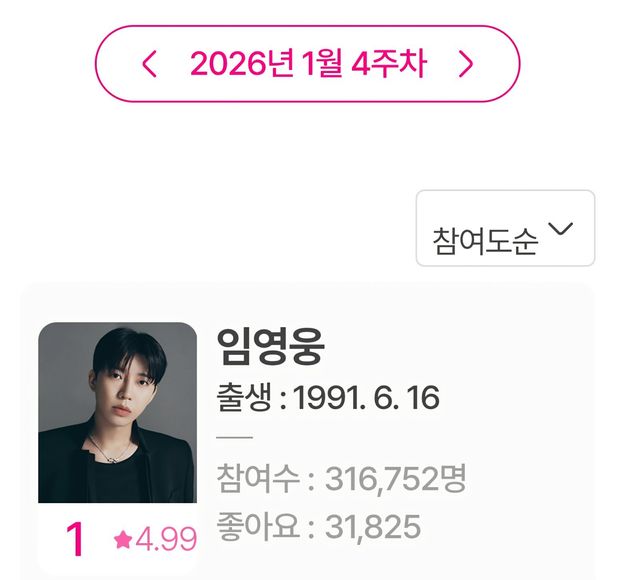아이돌차트에 따르면 임영웅은 1월 4주차 평점랭킹에서 31만6752표를 얻어 최다 득표로 1위를 차지했다. 이 결과로 임영웅은 2021년 초부터 시작된 평점랭킹 1위 자리를 약 4년 10개월 동안 한 번도 내주지 않으며 253주 연속 정상이라는 기록을 세웠다. 단기간 성과가 아닌 장기 집계 지표에서 이어진 기록이라는 점에서 의미가 크다.