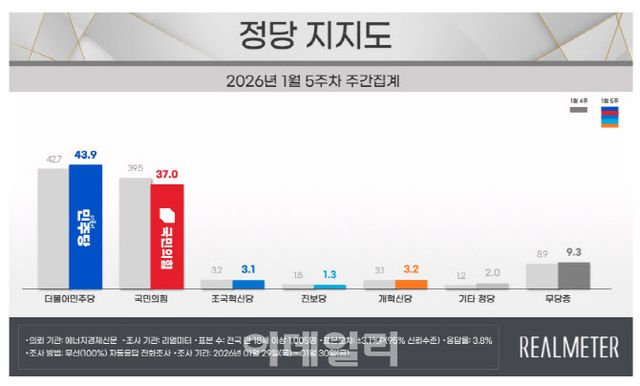 리얼미터는 “더불어민주당은 코스피·코스닥 시장 호황과 1·29 부동산 대책 효과로 부산·울산·경남과 서울, 자영업자층 등에서 지지율을 상당 폭 끌어올렸다”며 “국민의힘 내부 갈등이 부각되면서 일부 청년층의 반사이익도 작용한 것으로 보인다”고 분석했다.