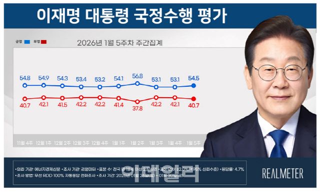 여론조사 전문기관 리얼미터가 에너지경제신문 의뢰로 지난달 26일부터 30일까지 닷새간 전국 18세 이상 유권자 2516명을 대상으로 조사한 결과, 이 대통령의 국정 수행에 대한 긍정 평가는 54.5%로 집계됐다. 이는 지난주(1월 4주차) 대비 1.4%포인트 오른 수치다. 반면 부정 평가는 40.7%로 1.4%포인트 하락했다. 긍정과 부정 평가의 격차는 13.8%포인트로 확대됐으며, ‘잘 모름’은 4.8%였다.
