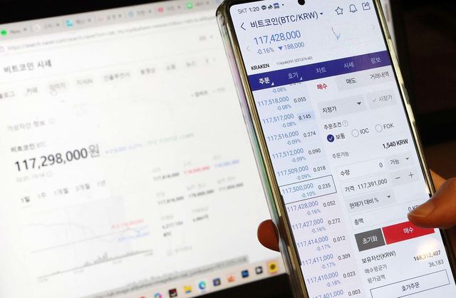 1일 서울시내에서 한 시민이 비트코인 시세를 확인하고 있다. / 뉴스1