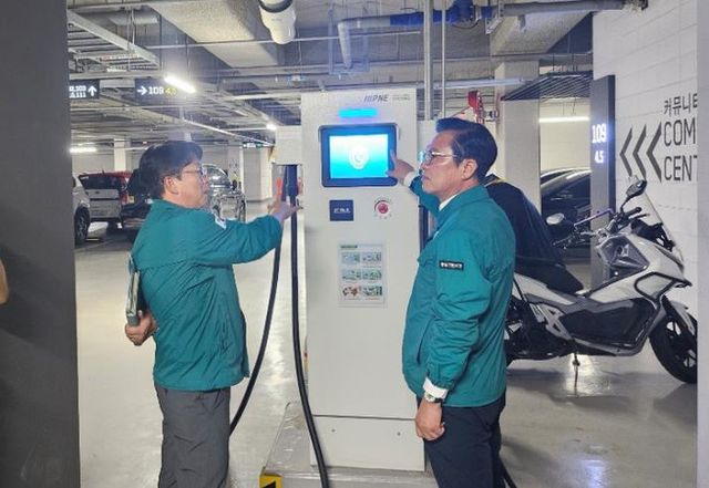 | ▲ 김석필 천안시장 권한대행 부시장이 공동주택 지하주차장 전기차 충전시설을 점검하고 있다. |