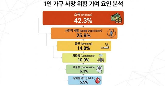 이러한 사망 위험 증가에는 경제적, 심리적 요인과 생활 습관이 복합적으로 얽혀 있었다. 인과 매개분석 결과 소득 수준은 사망 위험 증가에 약 42.3%의 기여도를 보이며 가장 강력한 영향력을 행사하는 요인으로 꼽혔다. 이외에도 사회적 박탈 지수(거주 환경이나 사회적 혜택 등에서 소외된 정도), 흡연, 우울 증상, 외로움이 주요 매개 요인으로 식별됐다. 신체적 지표로는 당화혈색소(HbA1c, 최근 2~3개월 동안의 평균 혈당 수치)와 C-반응성 단백질(몸속 염증 반응을 나타내는 수치)이 상당한 매개 효과를 나타냈으며, 질환 중에서는 심혈관질환과 당뇨병, 고혈압 순으로 영향이 컸다.