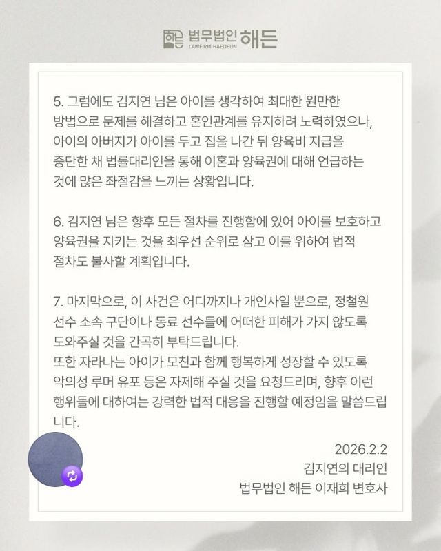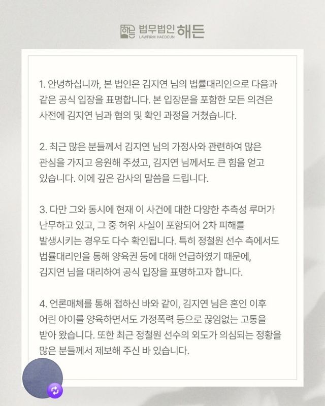 인플루언서이자 정철원의 아내 김지연은 2일 소셜미디어(SNS)에 법무법인 해든의 공식 입장문을 공유했다. 김지연의 법률대리인은 "다양한 추측성 루머가 난무하고 있고, 그 중 허위 사실이 포함되어 2차 피해를 발생시키는 경우도 다수 확인된다. 특히 정철원 선수 측에서도 법률대리인을 통해 양육권 등에 대해 언급하였기 때문에 김지연 님을 대리하여 공식 입장을 표명하고자 한다. 김지연 님은 혼인 이후 어린 아이를 양육하면서도 가정폭력 등으로 끊임없는 고통을 받아 왔다. 또한 최근 정철원 선수의 외도가 의심되는 정황을 많은 분들께서 제부해 주신 바 있다"라고 전했다. 이어 "향후 진행될 모든 절차에서 아이를 보호하고 양육권을 지키는 것을 최우선 순위로 삼을 것이며 이를 위해 필요한 모든 법적 절차를 밟을 계획"이라고 강조했다.