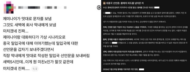 공유된 캡처에는 선언문 형식의 문장들이 담겼다. 문서 상단에는 수신인이 중국 국가주석 시진핑으로 표시돼 있었고 발신인은 A 씨로 표기된 것으로 알려졌다. 내용에는 바다를 건넜다는 식의 과장된 문구와 상대의 자존심을 언급하는 문장들이 포함됐다.
