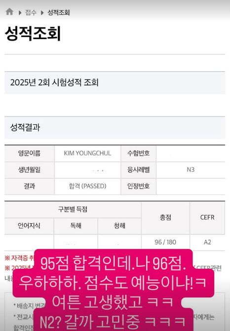 180점 만점 기준 커트라인 95점을 1점 넘긴 96점으로 합격했다. 김영철은 “여튼 고생했고. N2 갈까 고민 중. 아 신나신나”라고 덧붙이며 다음 목표도 내비쳤다.