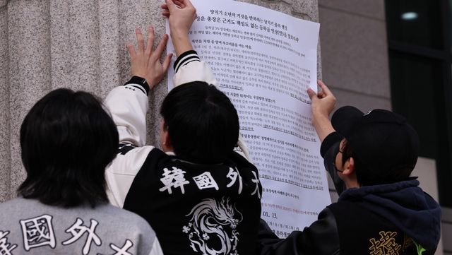 한국외국어대학교 총학생회를 비롯한 학생들이 지난 19일 오후 서울 동대문구 한국외대에서 학교 측이 제시한 올해 3.19%의 등록금 인상안에 항의하는 내용의 대자보를 붙이고 있다. / 뉴스1