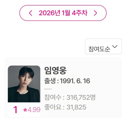 최근 아이돌차트에 따르면, 임영웅은 1월 4주 차 평점랭킹에서 31만 6,752표를 획득해 최다 득표를 기록했다.