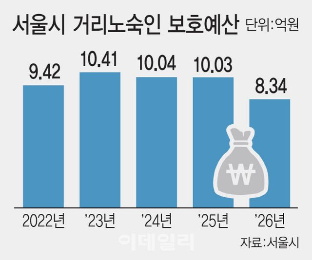 1일 이데일리 취재를 종합하면 서울시는 올해 ‘거리 노숙인 보호 예산’으로 총 8억 3396만원을 책정했다. 지난해(10억 338만원)보다 약 20% 줄어든 수치다. 이 예산이 △2022년 9억 4181만원 △2023년 10억 4098만원 △2024년 10억 399만원 등 최근 몇 년간 10억원 안팎을 오간 것을 고려하면 대폭 감소한 것이다.