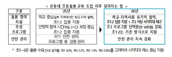 교육부는 2024년부터 늘봄학교 정책을 통해 초등학교 1‧2학년의 돌봄 공백 해소를 집중적으로 지원해 왔다. 2026년부터는 기존의 늘봄학교를 ‘온동네 초등돌봄‧교육’ 정책으로 발전시켜, ①학교와 지역사회가 함께 희망하는 초등학생에게 사각지대 없는 돌봄을 제공하고, ②돌봄보다 교육에 대한 수요가 큰 초등학교 3학년 이상 학생*의 방과후 교육 참여를 중점 지원한다.