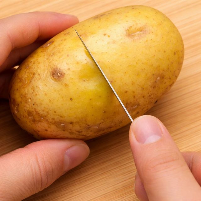 이 상태에서 감자의 양끝을 잡고 칼집이 난 방향으로 살짝 비틀듯 당기면 껍질이 매끈하게 분리된다. 한쪽에서 잡아당기면 반대쪽까지 한 번에 벗겨진다. 손에 힘을 줄 필요도 거의 없다.