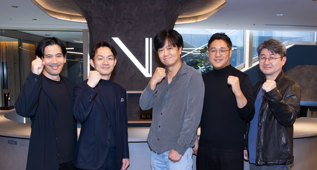 (좌측부터) 아카하네 토모후미 더세븐 CVO, 세토구치 카츠아키 더세븐 CEO, 정성진 M83 CEO, 윤라울 M83 CSO, 노극태 모터헤드 CEO. ⓒ M83