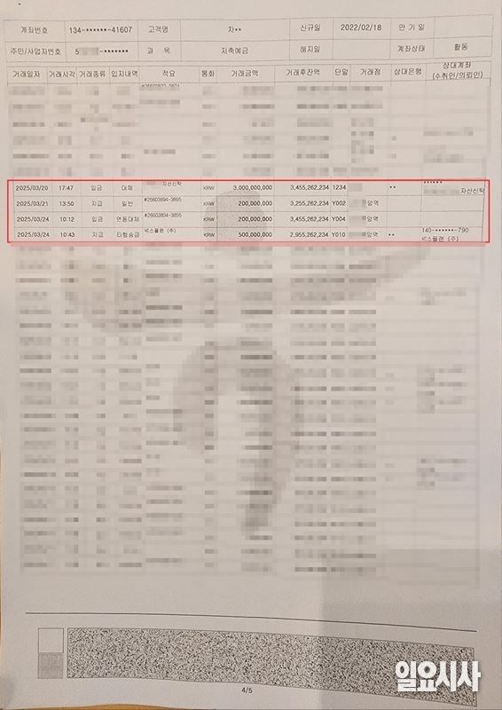 실제 통장 거래내역을 보면 2024년 10월25일 오후 2시39분 차대영 명의의 하나은행 계좌에서 A 신탁 계좌로 30억원이 ‘에테르노 압구정 102호 분양대금 일부’ 명목으로 이체됐다. 오후 2시44분 이 거래는 취소됐고 다시 오후 2시50분 같은 금액을 재이체했다.